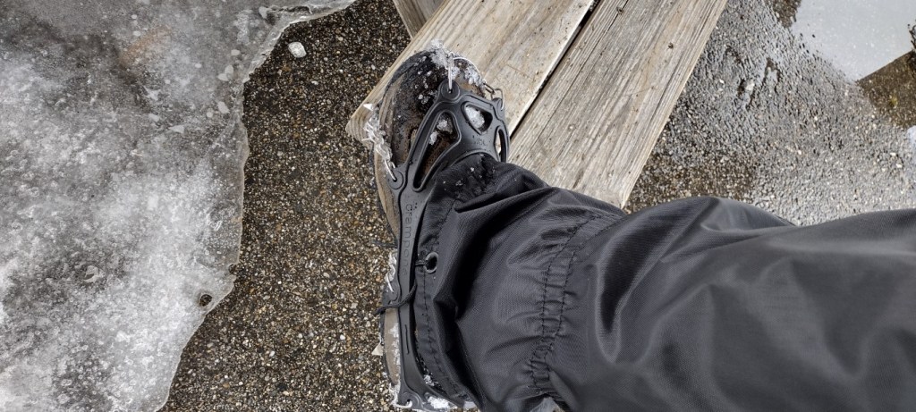 The snow was hard-packed on the trail and about a foot thick. Good traction. I think I’d have been fine barebooting, but I wore microspikes the entire trip up and down. They helped a lot on the way down, preventing slipping on the snow and ice.
