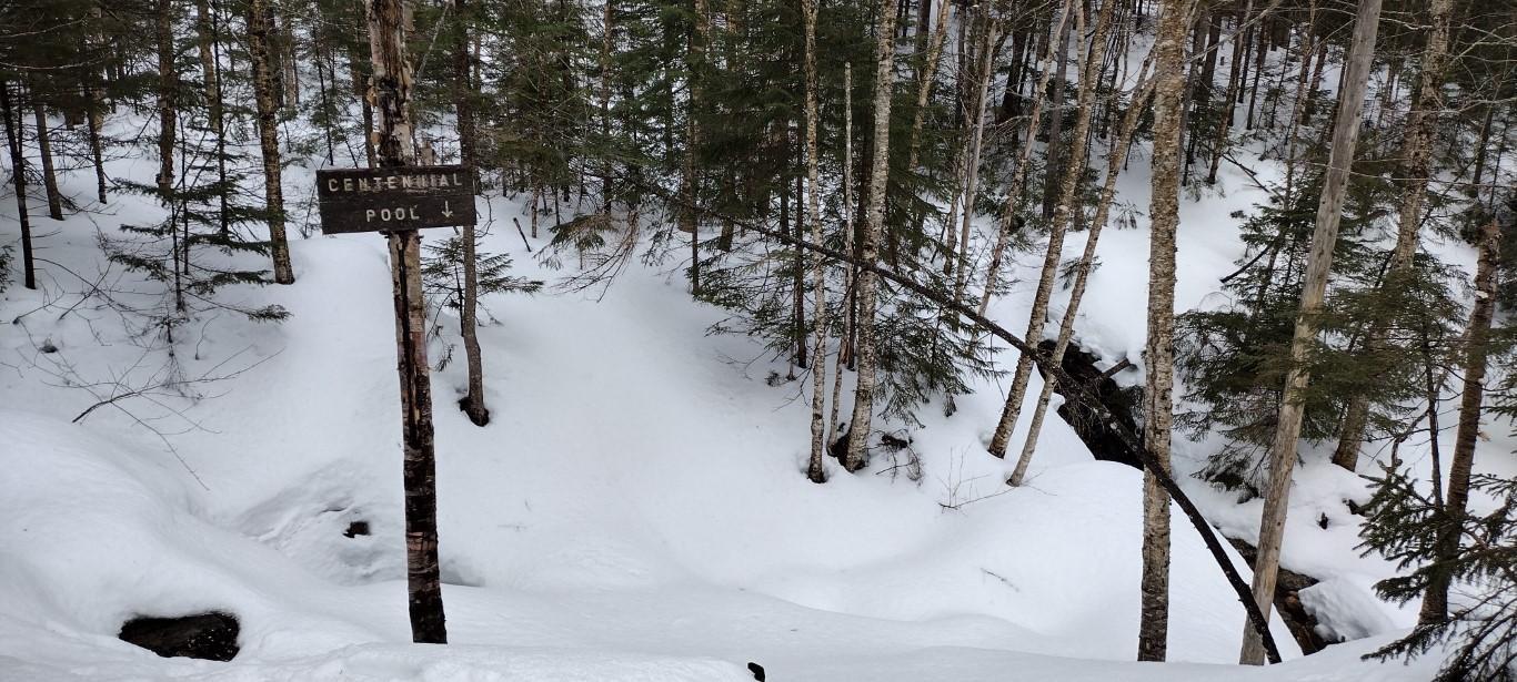 After a short walk, the Mt. Willard Trail heads off to the left while the trail to Mt. Avalon and beyond continues straight. There’s a stream crossing not far after the turn, and then the ascent takes you along the south side of that stream, which turns into a gorge. There was an overlook with a sign stating Centennial Pool, but there was no pool evident- everything was frozen and snow covered.