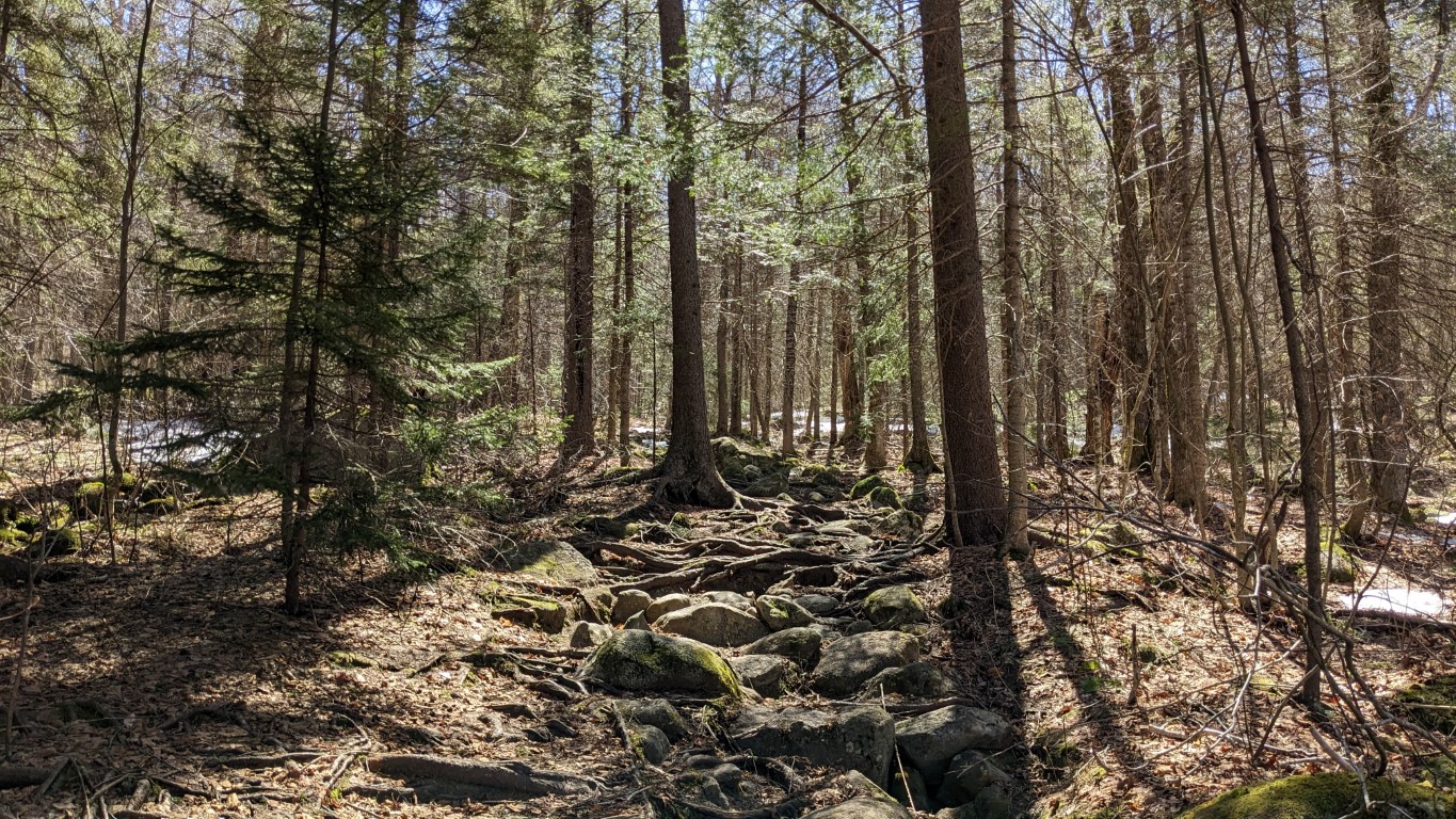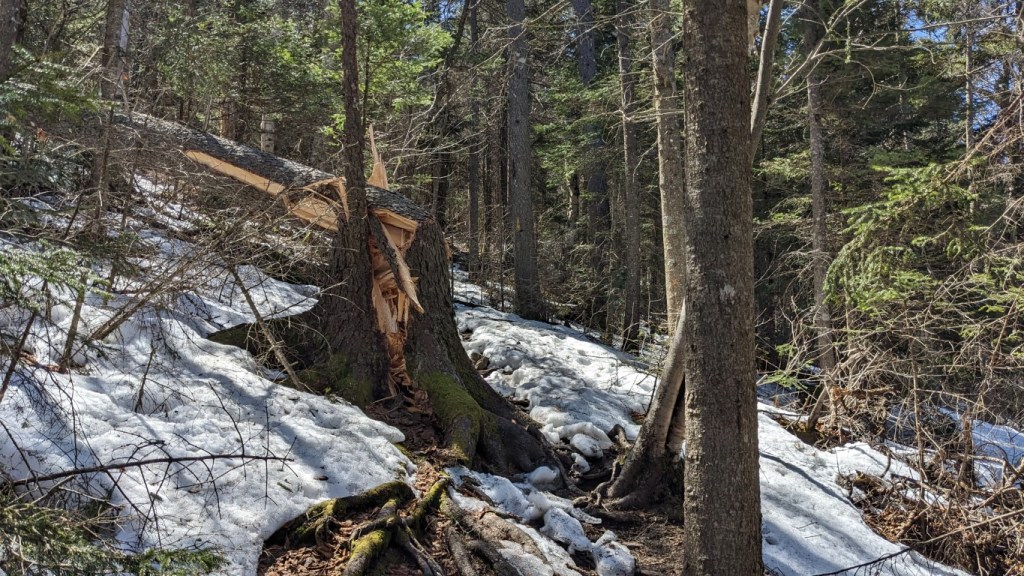 At this point the trail becomes more of what’s expected in the Whites- narrower, and rockier, with plenty of tree roots mixed in for good measure. A steeper incline, too. More water was in and on the trail, so there was more mud on this second half. This trail approaches the summit from the north side of the hill, so the snow and ice were hanging in there.
