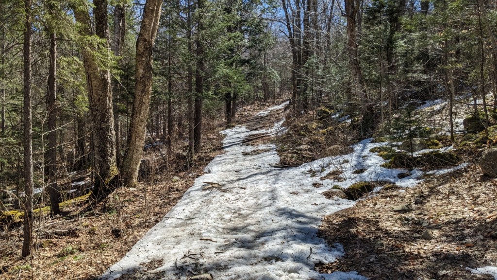 There was some snow in patches on the road heading down, but all of them easily crossed. Traction was good, and there were plenty of options to avoid what ice was left. Where the ground was clear there were muddy and squishy spots, but nothing to slow down the pace.