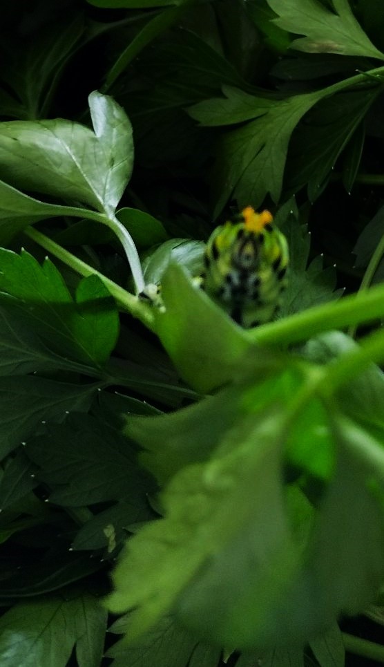 When preparing the parsley to be dried, Wife noticed something looking at her, and then made a new friend. After recovering from the surprise, she returned the swallowtail caterpillar back to the herb bed. He’s welcome to whatever’s left out there.