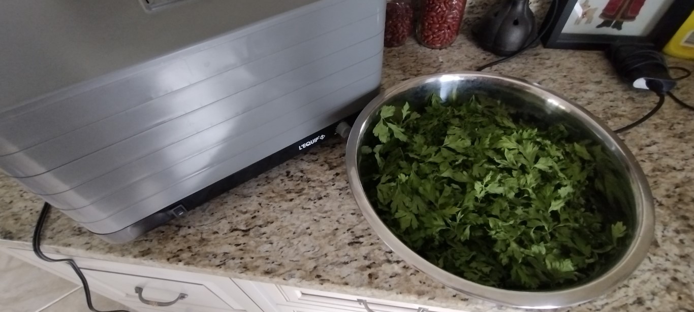 When preparing the parsley to be dried, Wife noticed something looking at her, and then made a new friend. After recovering from the surprise, she returned the swallowtail caterpillar back to the herb bed. He’s welcome to whatever’s left out there.