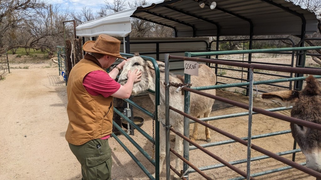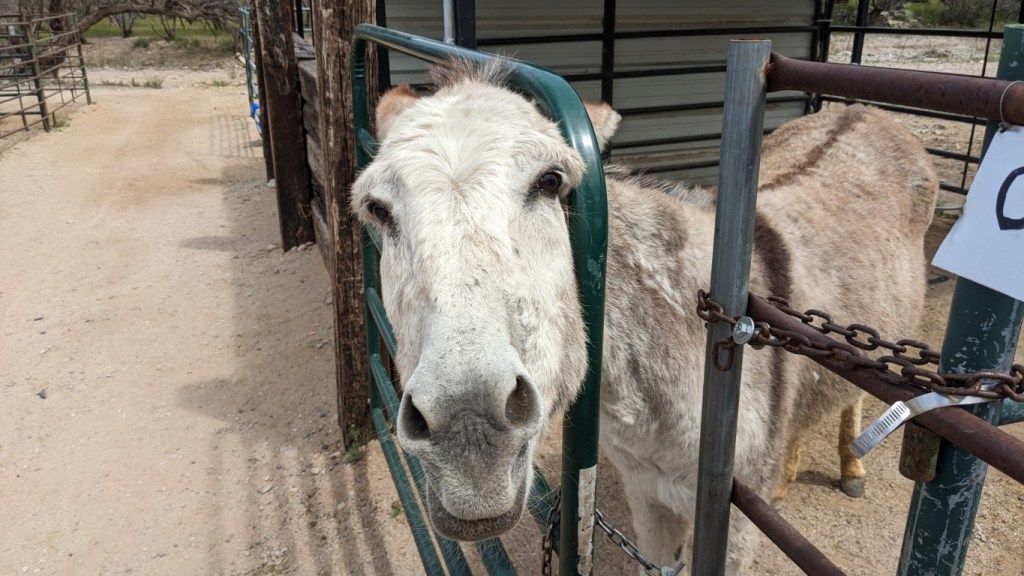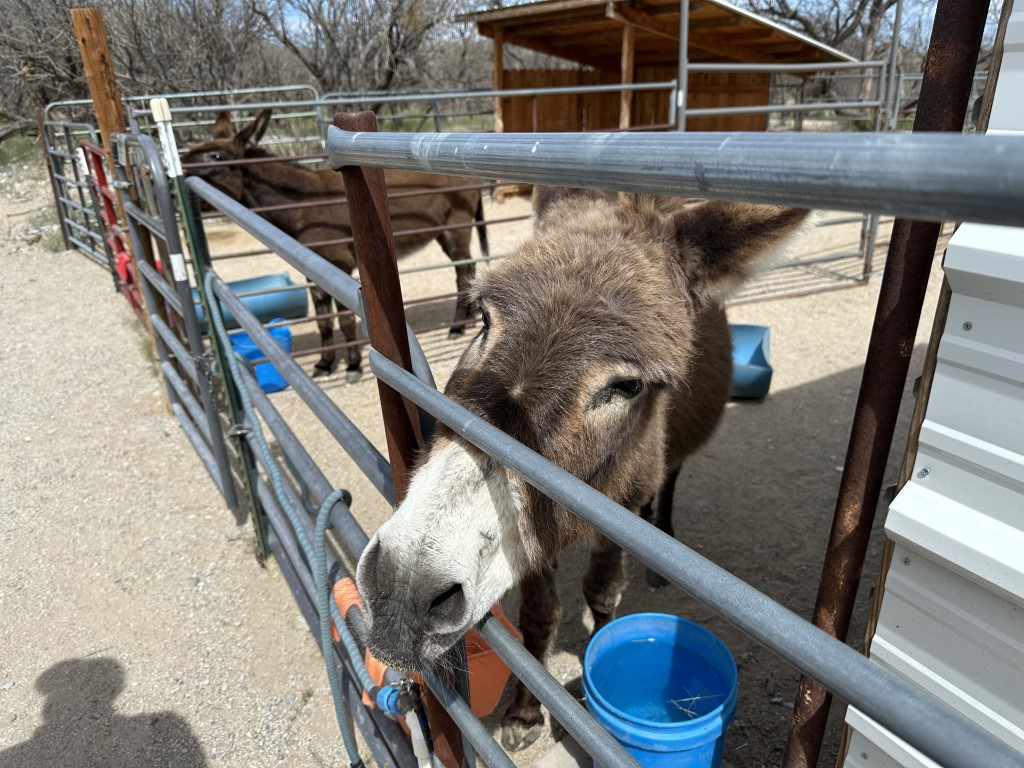 Wife, Son and I scheduled our visit for last Saturday morning. The Forever Home is located in Benson, about an hour and a half from Tucson. We arrived a little early, and met Tish at the small building that serves as the office. After introductions, Tish armed herself with a bucket of animal crackers, and took us to meet the donkeys.