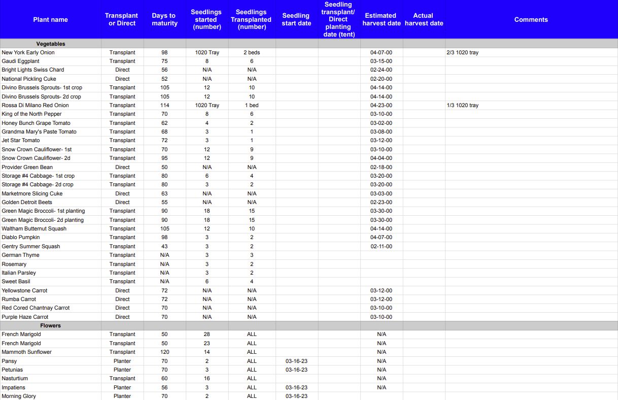 Saturday is April 1st, and I’ll start over 100 vegetable seedlings and sixty or so flowers.That will give everything 8+ weeks to be ready to be set out, which I time for June 1st. Except for the onions. They’ll go in around the middle of May or thereabouts. For those of you that followed last year’s “Garden 2022” posts, here’s this year’s tracking sheet.